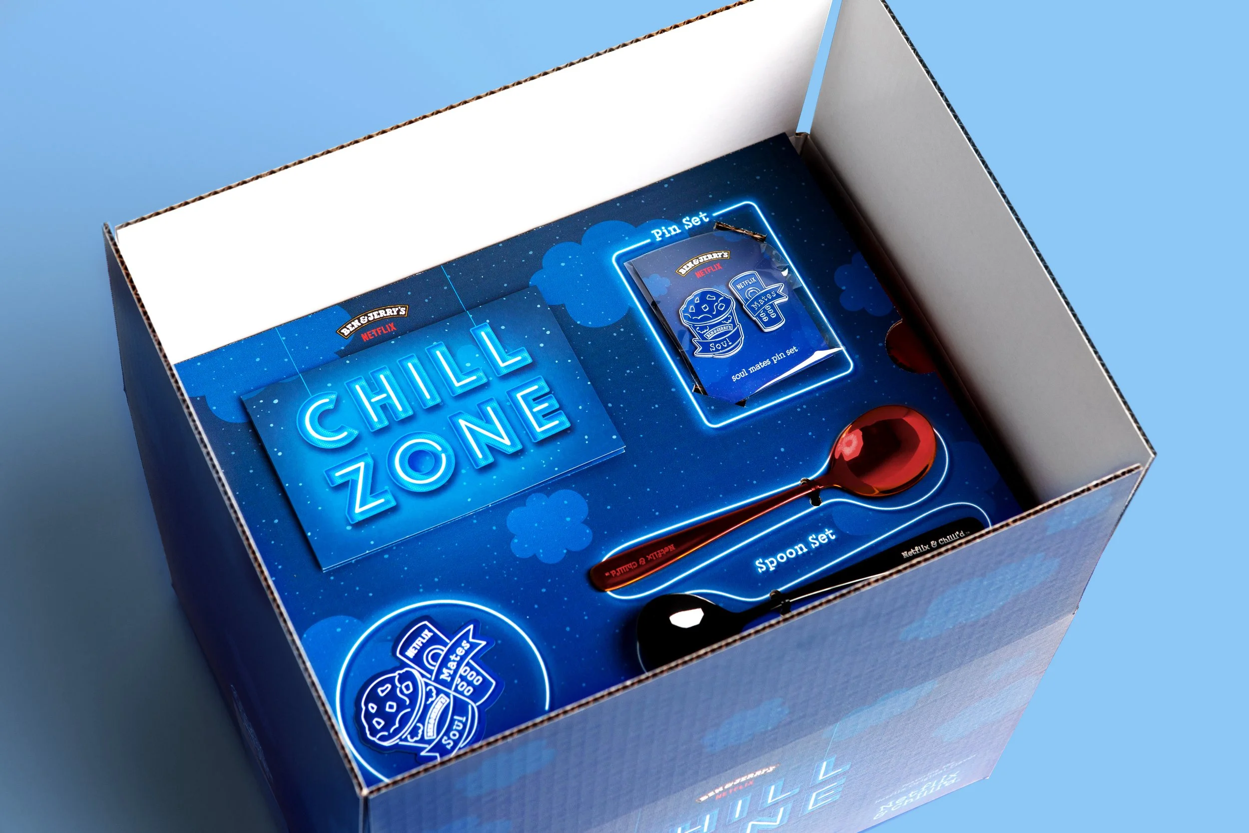 Merch & influencer kit for Ben & Jerry’s Netflix & Chillled flavor launch. Custom products were created to perfectly fit the average Netflix-bingers needs–a pillow that has openings for your print & your remote and extra swag to match.